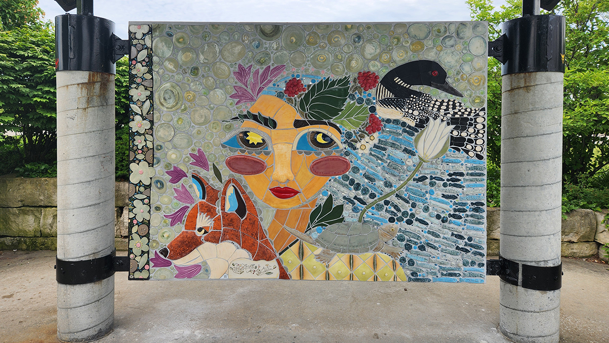 Regionally-based artists Angela Aujla and Meg Leslie collaborated on this artwork and its theme. Aujla drew the illustration and Leslie created hand-formed and hand-glazed porcelain tiles. It was installed on-site by the artists with support from Barrie’s Parks Planning team. The design was inspired by Kempenfelt Bay and its role as a habitat for wildlife and plants. Themes of ecology, conservation, and the stewardship of our natural environment emerge from the image integrating human, animal and plant species.