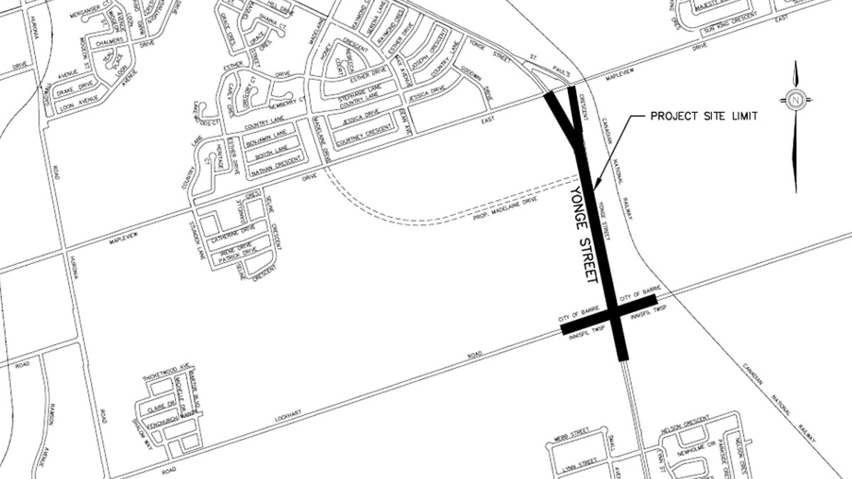 Transportation improvements include reconstruction and widening of Yonge Street (Mapleview E to Lockhart) to inlcude five lanes, a cycle-track and a sidewalk. The project will also include reconstructing St. Paul Crescent (Mapleview E to Yonge).