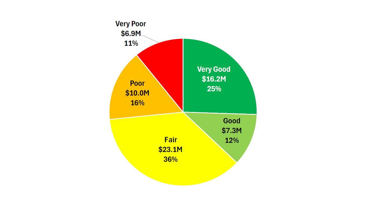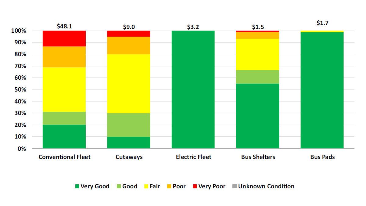 Overall, the transit asset replacement value is approximately $63M and transit assets are in fair condition.
