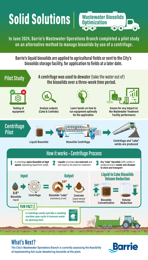 In 2024, the Wastewater Operations Branch conducted a three-week pilot of a dewatering centrifuge. This technology removes water from the biosolids produced during wastewater treatment, creating a more concentrated product, which reduces the amount of trucking required to utilize the biosolids. See the below infographic for details on the process.